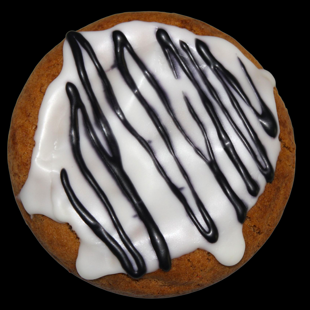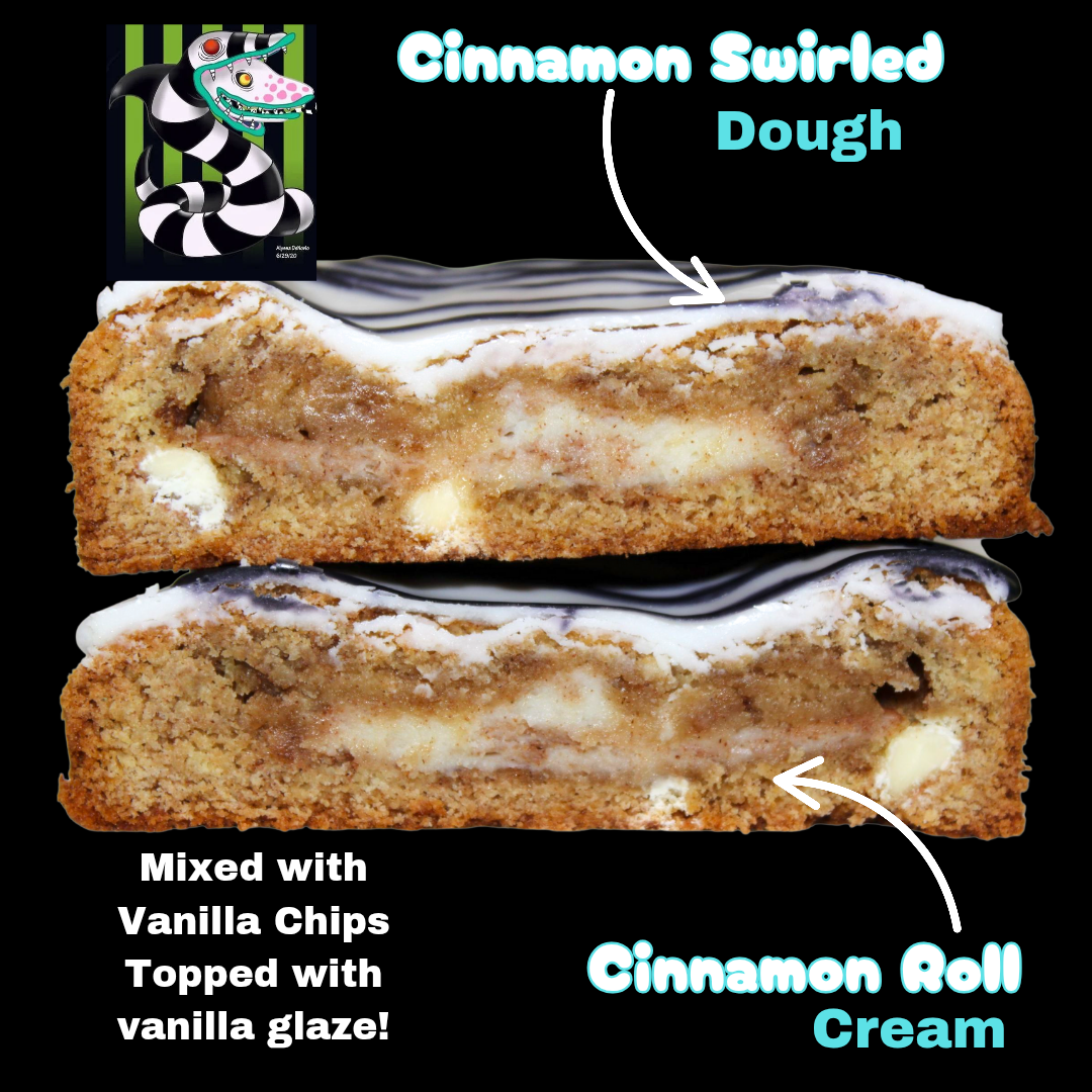 A cinnamon-swirled cookie inspired by Beetlejuice’s most iconic creature! Soft cinnamon dough mixed with vanilla cream chips, stuffed with gooey cinnamon roll cream, and topped with a smooth vanilla glaze. Dangerously delicious.